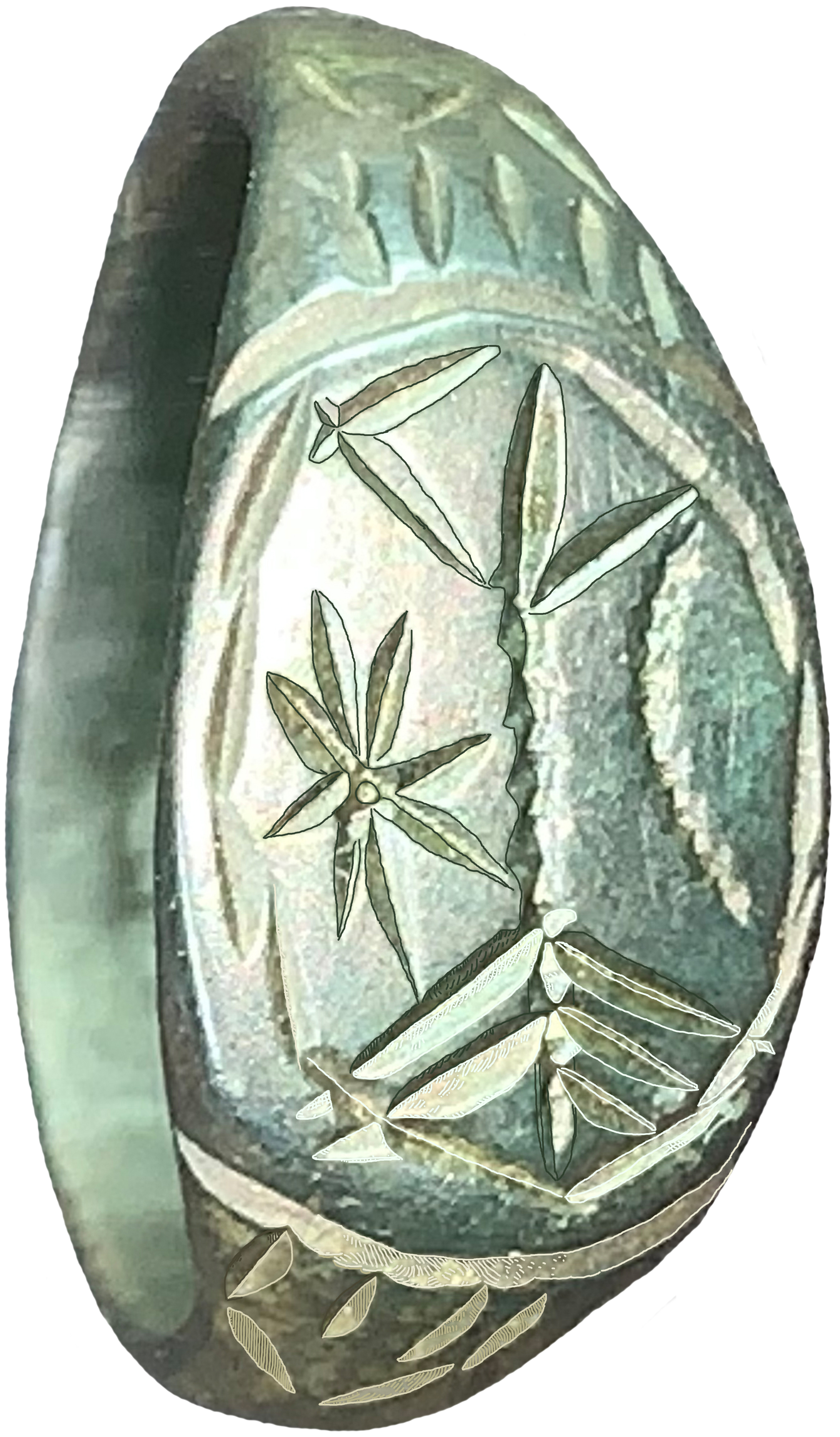 23. ábra. Az ibrányi honfoglalás kori ezüstkarperec Isten (ős + ten) olvasatú tulipánjának középső szirmában (amely szokás szerint az ős ligatúraszerű hieroglifája) megjelenik a szár jel is